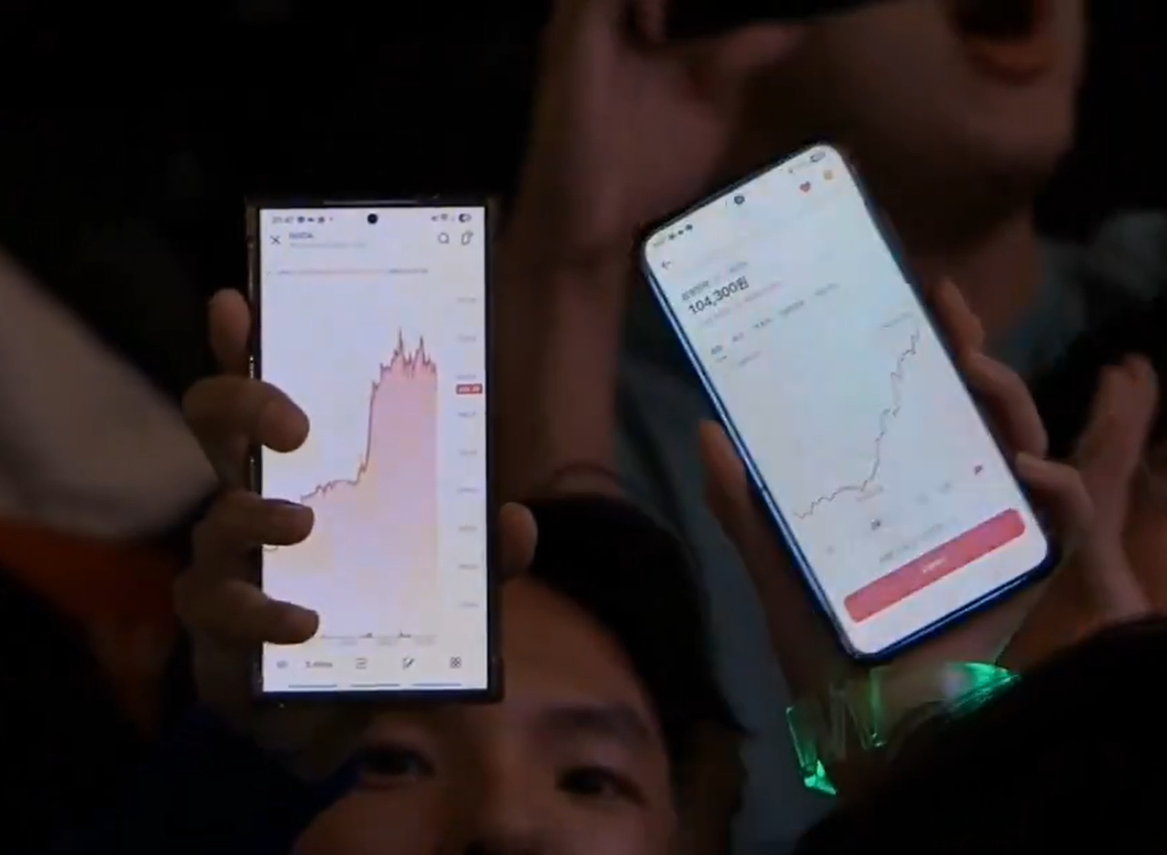 때마침 카메라가 관객석을 비췄고, 한 참석자가 '10만 전자'와 '시총 5조 달러'를 넘어선 삼성전자와 엔비디아의 주식 차트를 흔들어 보였습니다.