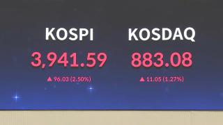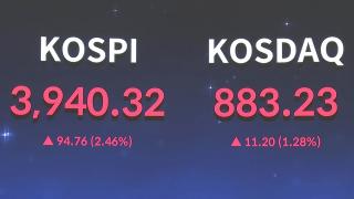 [속보] 코스피, 3,940선 마감하며 사상 최고치…'4천피' 가시권오늘 코스피가 2%대 급등을 보여 3,940선을 돌파하며 마감해 4,000선이 가시권에 들어왔습니다.오늘 코스피는 어제보다 2.50% 오른 3,941.59에 마감했습니다.대장주인 삼성전자가 2.38% 올라 9만8,800원으로 다시